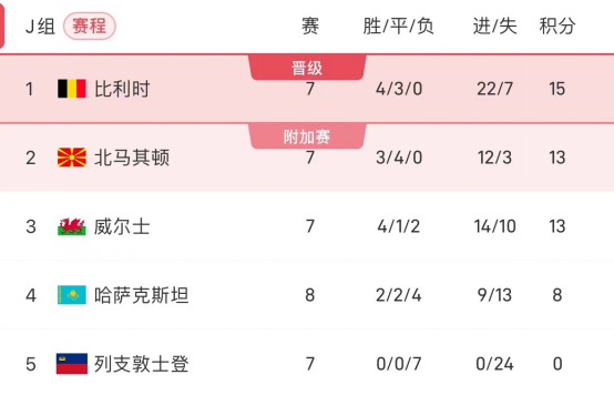美加墨世界杯欧洲区预选赛J组的竞争挺有意思,在比利时末轮击败列支敦士登完全没问题的情况下,位列二三位的北马其顿和威尔士同样已经确保了附加赛席位。